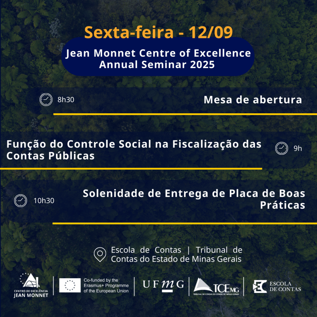 O CEJM-UFMG e o TCE-MG têm a satisfação de anunciar o II Seminário Internacional 2025/02 – Jean Monnet Centre of Excellence | UFMG!