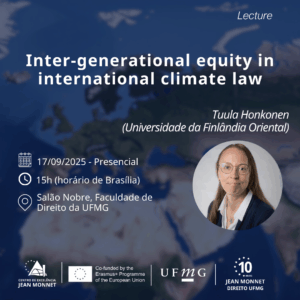 Palestra: Equidade Intergeracional no Direito Internacional do Clima Convidamos você para a palestra da Professora Tuula Honkonen (Universidade da Finlândia Oriental) sobre “Equidade Intergeracional no